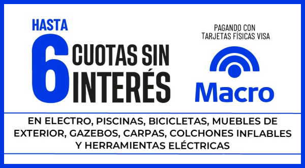 Durante Octubre y Noviembre aprovechá 3 y 6 cuotas sin interés con tarjetas VISA del Banco Macro en Diarco. Válido para electro, muebles, herramientas, piscinas, camping y bicicletas.