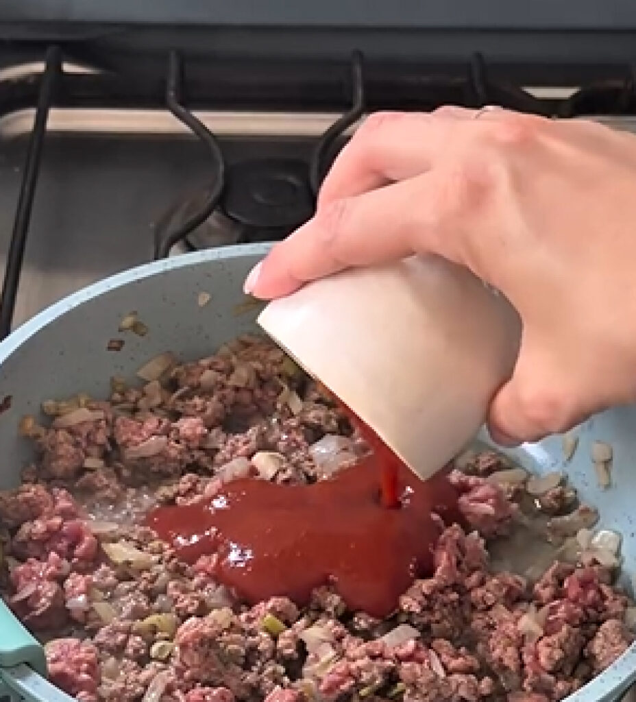 En una sartén con un poco de aceite de oliva, dorar la cebolla, el ajo y el puerro. Agregar la carne picada y cocinar hasta que esté bien dorada. Sumar el puré de tomate OKEY, condimentar con sal, pimienta y pimentón. Mezclar bien y reservar.