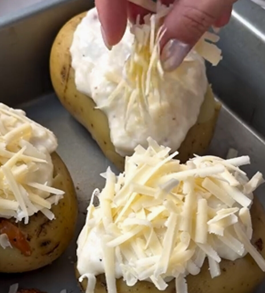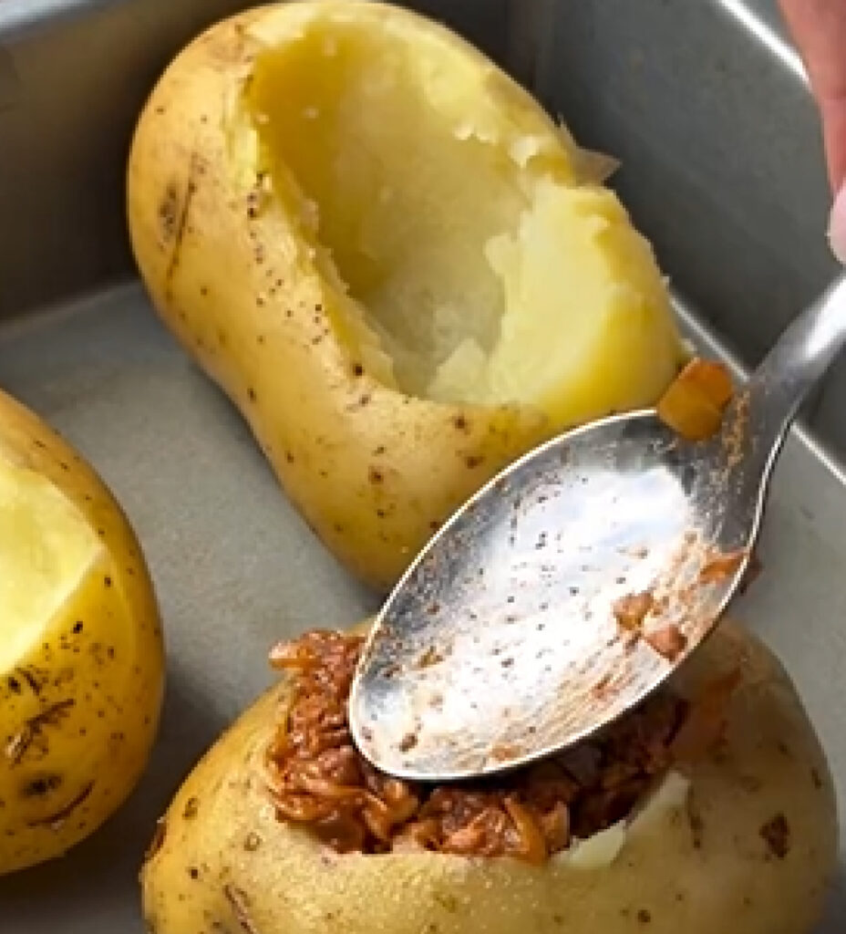 Ahuecar las papas con cuidado usando una cuchara. Rellenarlas con la preparación de carne y cubrir con la salsa blanca.